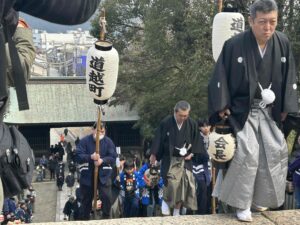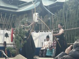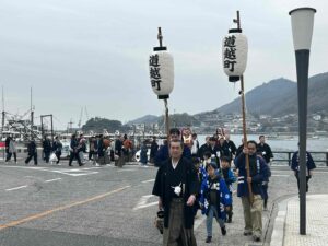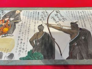 鞆の新春の風物詩となった「お弓神事」が無事に終わりました。弓を放つ弓主や息を呑んで見守る人たちの光景がいまも鮮明に浮かんできます。今年は例年にない温い日となり、金的に見ごとに的中!緊迫した空気の中で行われるお弓神事の一日は、鞆の古い町並みと重なり、今年もまるで絵巻物を見ているように流れていきました。鞆てらすでは、上月ひとみさんの作品である「お弓神事絵巻」が展示中です。